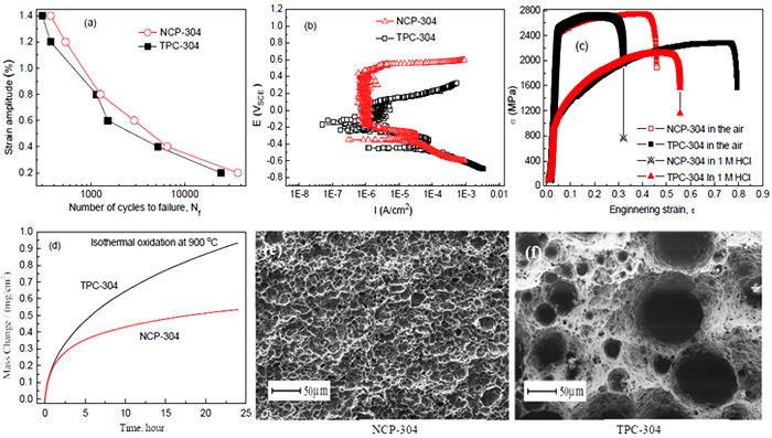 圖1. 納米晶和普通304不銹鋼應(yīng)變疲勞、電化學(xué)腐蝕、應(yīng)力腐蝕和高溫氧化性能