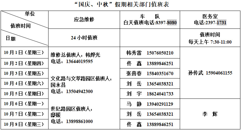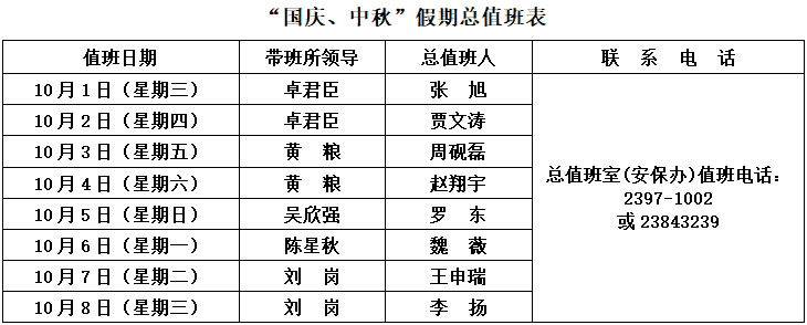 總值班室(安保辦)24小時值班,自當日8:00至次日8:00。總值班室電話:23843239,2397-1002